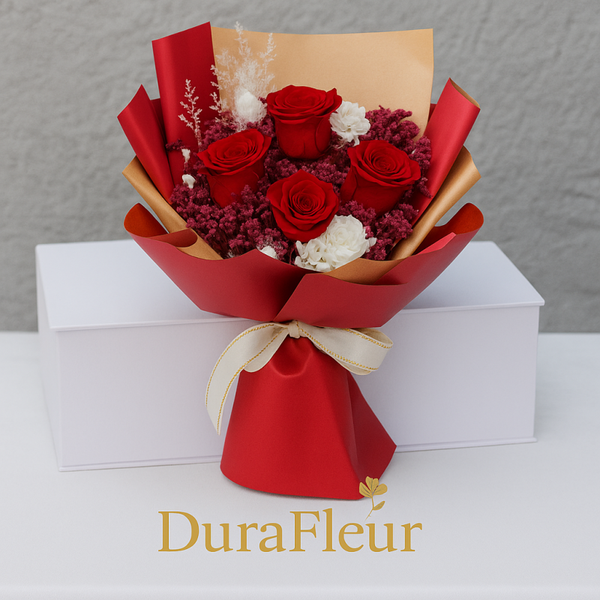 Of laat je hart spreken met het Luxe Boeket van DuraFleur – een schitterende compositie van echte, gepreserveerde rozen en subtiele bloemdetailles, met zorg gerangschikt tot een meesterwerk van natuurlijke elegantie.